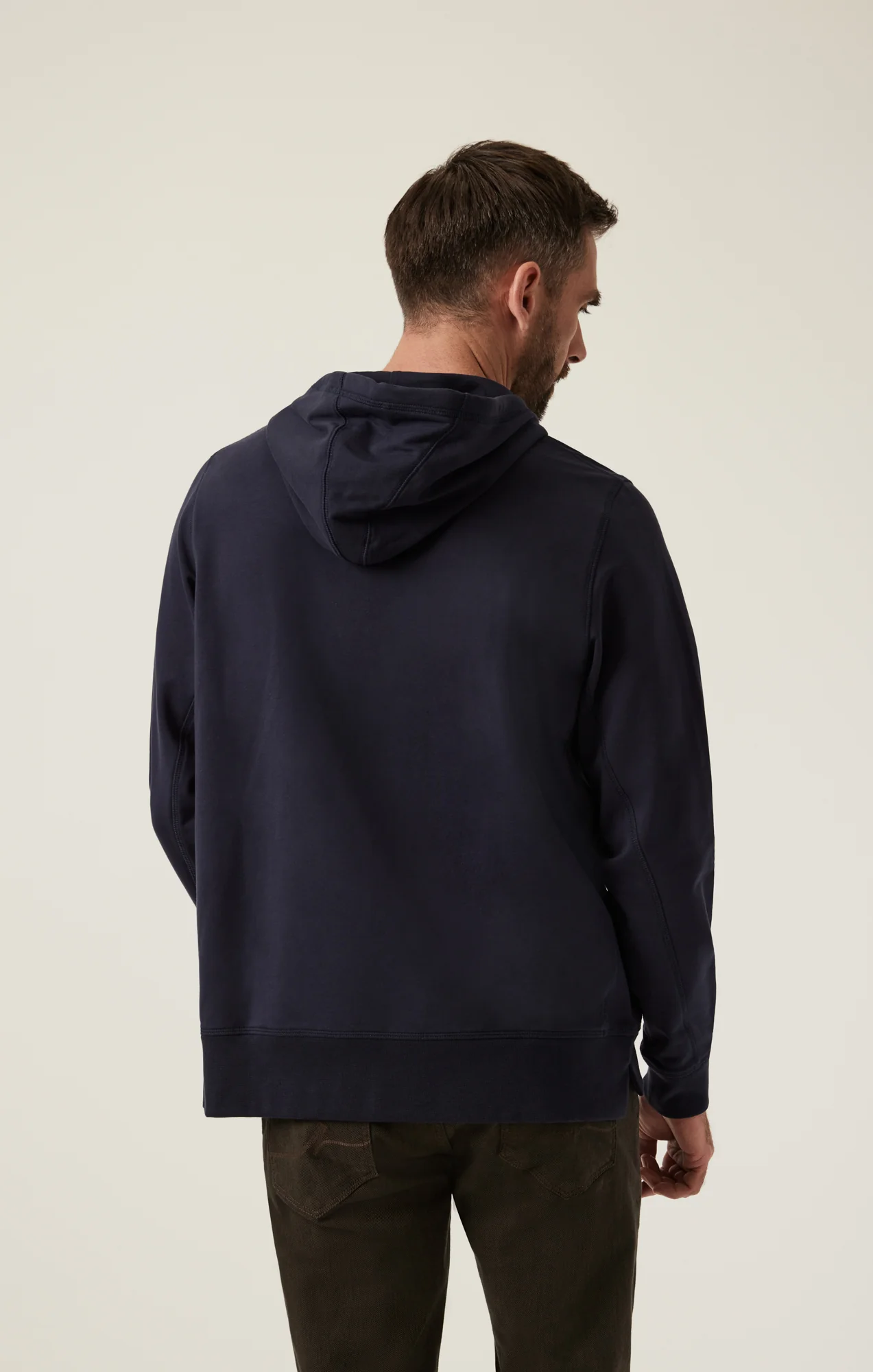 Finished in a classic navy hue, this hoodie is crafted in luxurious Pima cotton and spandex, giving it an ultra-soft feel with plenty of stretch. Subtle details like a relaxed collar and a large front pocket give this hooded sweatshirt a versatile, polished feel.